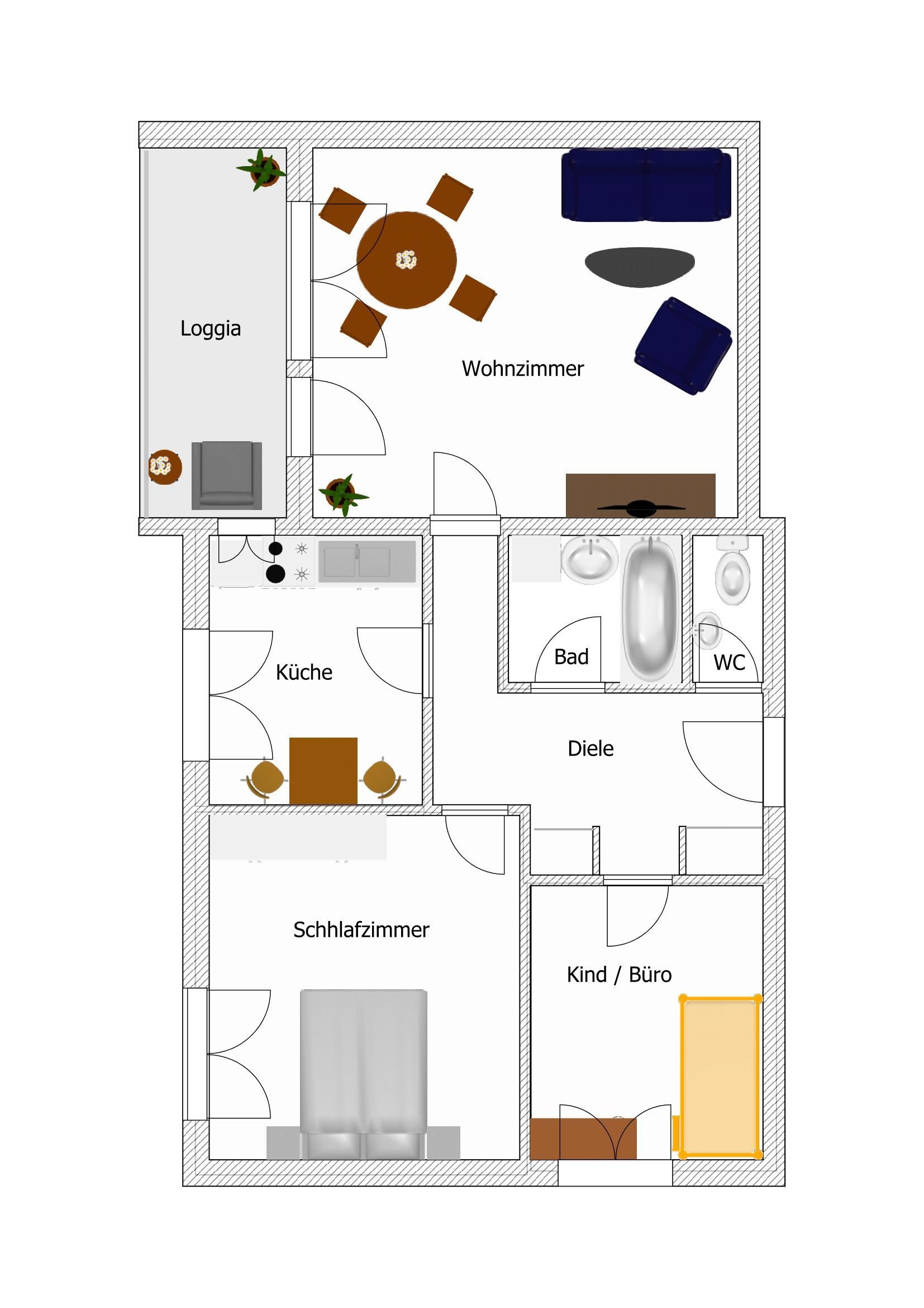 - Wohnzimmer mit Loggia, Schlafzimmer, Kinderzimmer, Küche; großzügige Diele; Wannenbad, separates WC, Einbauschrank in der Diele, Keller-abstellkammer